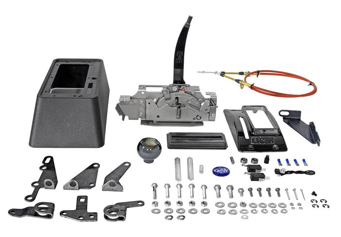 The classic B&M black QuickSilver features a black PVD coating. Features a reverse lockout that meets NHRA and IHRA safety regulations. The black chrome bezel, shift stick and black knob all feature a black finish that blends nicely with the console and the shift boot. The shifter includes a lighted gear position indicator in the bezel, a micro-switch for back-up lights and a neutral safety switch preventing accidental starts when in gear. Compatible with GM TH350, TH400, 700R4, 200R4, 4L60, 4L60E - 4L80E transmissions (w/o PRNDL switch), Ford C4, C5, C6 and Mopar A727 and A904 transmissions right out of the box. Bracket and Lever kits available separately for other 4-speed automatic transmissions.